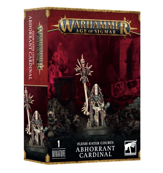 Questo kit multicomponente di plastica permette di assemblare un Cardinale Ripugnante, un sanguinario sacerdote delle Corti Mangiacarne. Il Cardinale solleva in alto un pastorale di ossa consacrate, il ricettacolo perfetto per il suo malvagio potere. Abbigliato con una mescolanza di vesti lacere e amuleti disgustosi, diffonde e modella la follia delle masse cadaveriche, trasformando mordant affamati in fanatici rabbiosi.