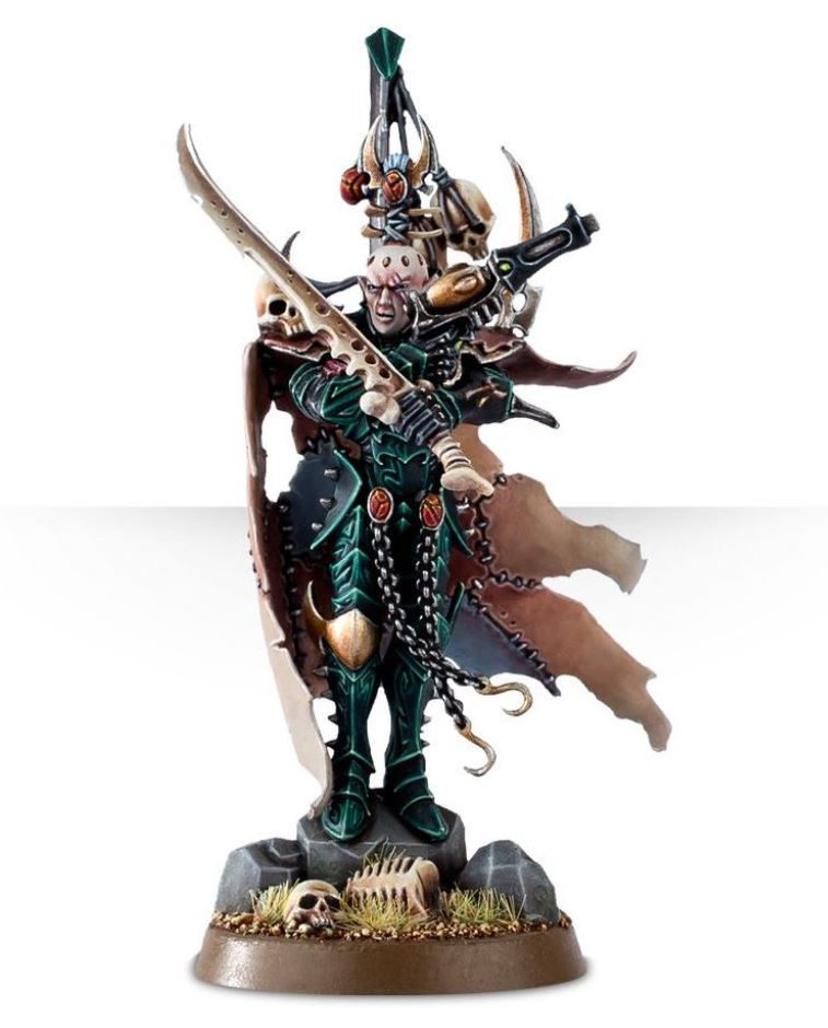Questo kit da 11 componenti permette di assemblare un Archon. Il modello è protetto da un'armatura dei Kabalites decorata con rune e brandisce una lama necrotica e una pistola a schegge. Il mantello di pelle e la rastrelliera di trofei montata sullo zaino sfoggiano orgogliosamente l'orribile bottino ottenuto in battaglia.