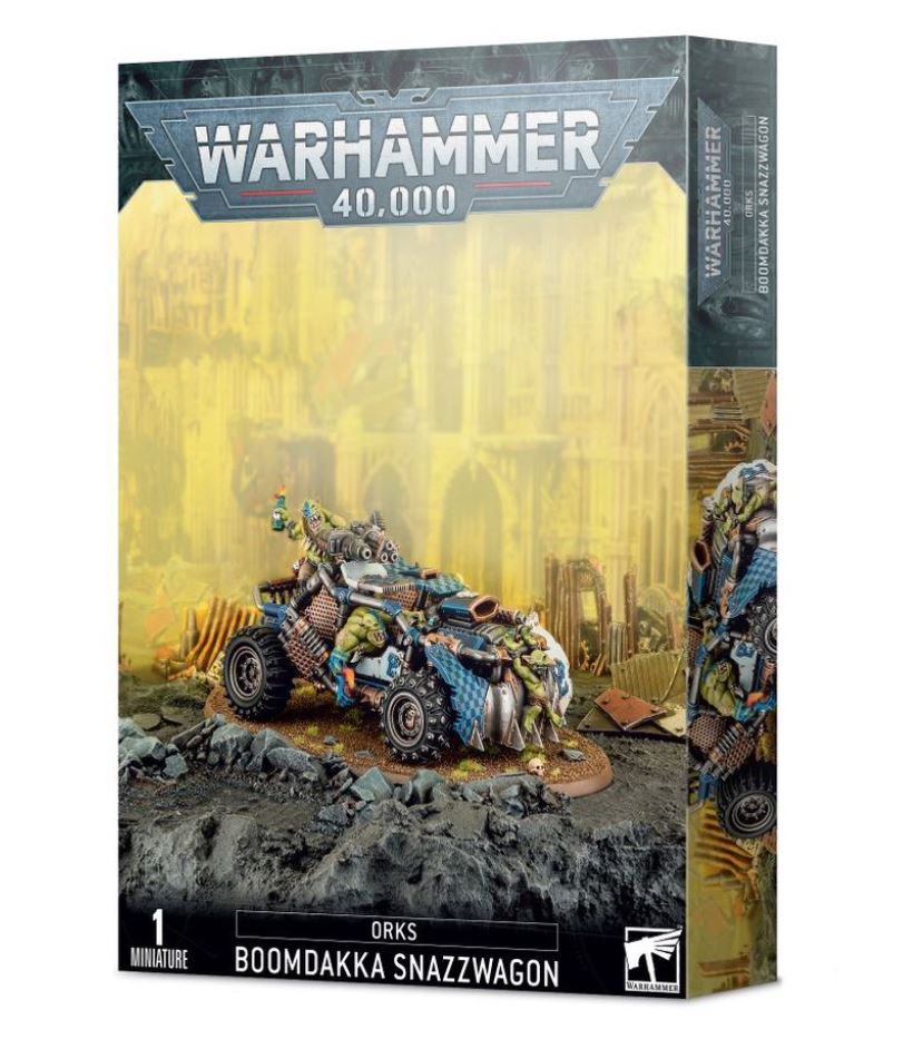 Questo kit multicomponente di plastica contiene le parti necessarie per assemblare un Boomdakka Snazzwagon. Al contrario dei soliti mezzi orkeschi in cui ogni singola area del veicolo è ricoperta da pezzi di metallo inchiodato, è progettato esclusivamente per la velocità: hai perfino l'opzione di assemblarlo senza tettuccio, con l'abitacolo esposto. Alla scocca è affissa una rete di tubi di scappamento e prese d'aria che alimentano l'enorme e potente motore montato sul davanti. Oltre al motore, la parte anteriore dello Snazzwagon presenta una gigantesca pala a cui è legato un Grot mascherato. Come se non ci fossero già abbastanza dettagli folli, alla sinistra della presa d'aria principale c'è una zpecialità del Mek. Il pilota è piegato sulla destra, pronto a lanciare uno zkottafiazko, mentre un altro Grot spara allegramente con uno zkoppia. Appeso precariamente al retro c'è un Burna Boy con uno zkottafiazko in una mano e il grilletto di uno zpara grozzo nell'altra.