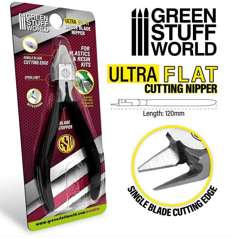 Tronchesina per taglio Super Raso da una sola lama e taglio raso in acciaio temprato. Una delle lame ha un profilo di taglio molto basso, e l'altra è dritta, per garantire tagli Super Raso perfetti. Specificamente sviluppato per materiali plastici e modellini in resina fino a 4 mm di spessore. Lunghezza: 120 mm, con una molla di ritorno e un impugnatura ergonomica rivestita in materiale antiscivolo per un massimo comfort e presa.